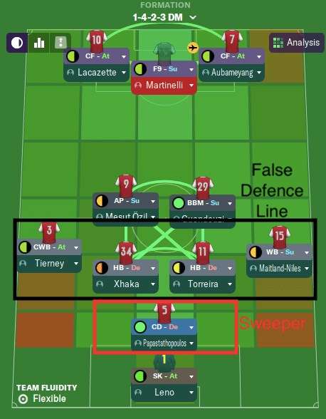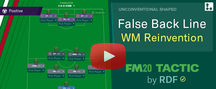 ” الخط الخلفي الكاذب ” هو شيء اخترعه RDF في FM20. الفكرة وراء ذلك هي أن اللاعبين الأربعة الذين يتقدمون على المدافع الأول (RWB ، LWB ، 2xDM) هم في الواقع الخط الخلفي “الحقيقي” حيث يلعب CB دور كاسحة. على نحو فعال ، إنه خط دفاع عالي للغاية حيث نستخدم المناطق العميقة في خط وسطنا كخط دفاع.