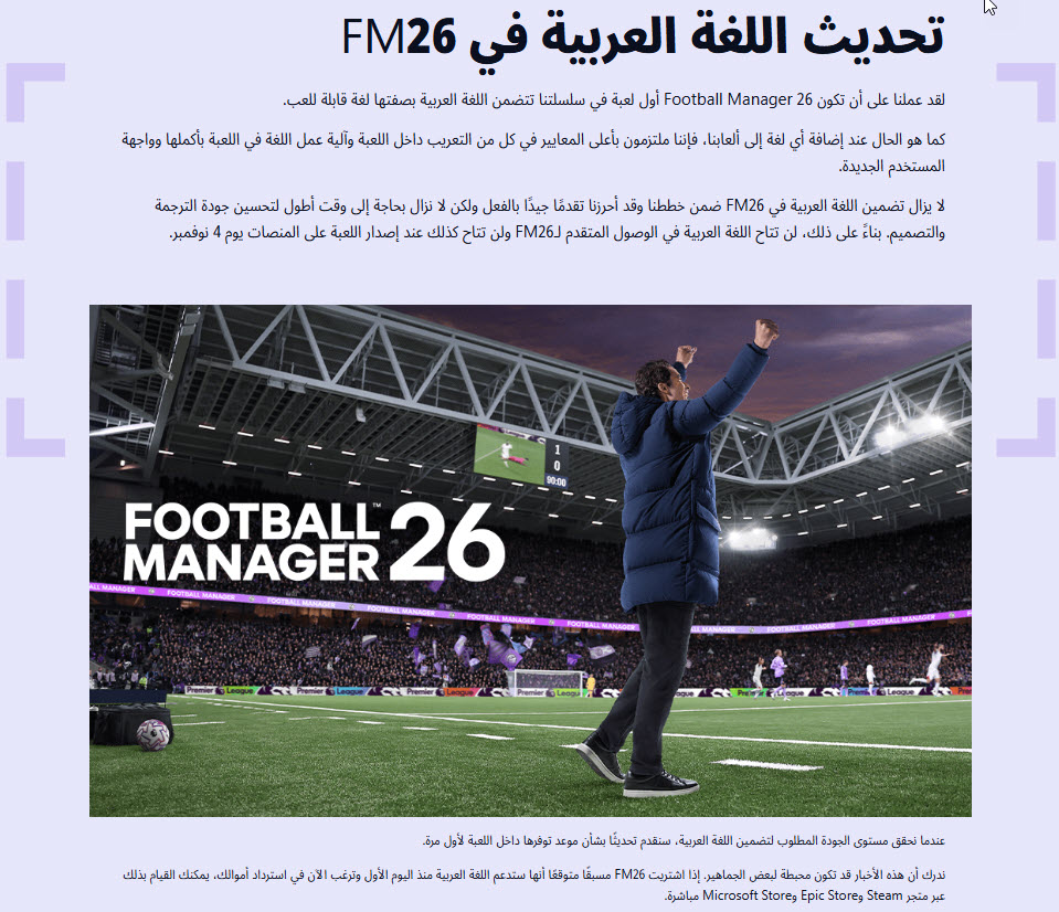 لا يزال تضمين اللغة العربية في FM26 ضمن خططنا وقد أحرزنا تقدمًا جيدًا بالفعل ولكن لا نزال بحاجة إلى وقت أطول لتحسين جودة الترجمة والتصميم. بناءً على ذلك، لن تتاح اللغة العربية في الوصول المتقدم لـFM26 ولن تتاح كذلك عند إصدار اللعبة على المنصات يوم 4 نوفمبر.